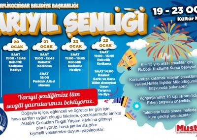 Eğlenceli etkinlikler, renkli oyunlar, çocuk sineması, animasyonlar, bilim deneyleri, maskotlar ve daha nice keyifli anlar için yarıyıl şenliğimizde buluşalım.